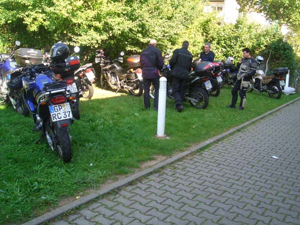 Unser Ziel dieses Jahr war mal kein landschaftliches, sondern lag in einer Großstadt. Grund: Wir wollten unseren Transalpfreund Frank zu seinem 40. Geburtstag zu Hause überraschen, was uns auch vollständig gelang. 14 Transalps vor dem Haus ist ja schon was. Dank schönem Wetter war die Tour dorthin sehr interessant. Wir fuhren kurvige und wenig befahrene Nebensträßchen, wie sie die Transalp halt so liebt. Die größte Überraschung bescherte uns eine Passstraße im Süden Heidelbergs, die wir so wohl eher im Schwarzwald gewähnt hätten.