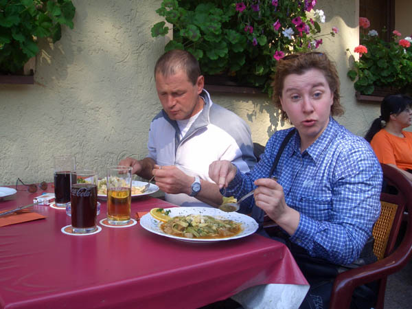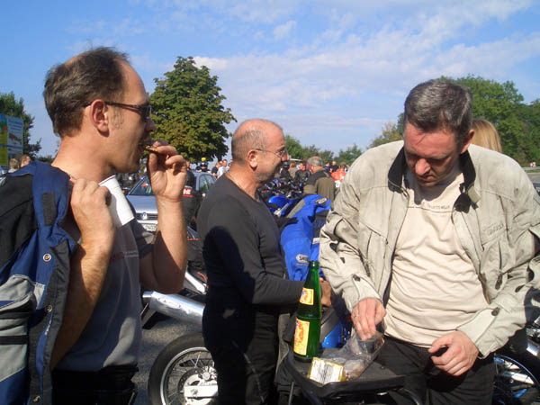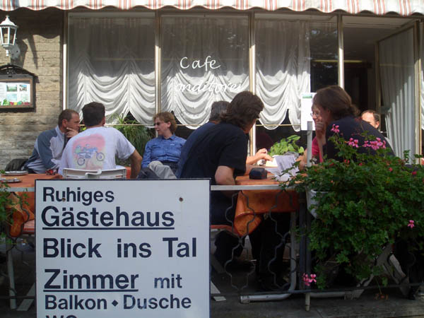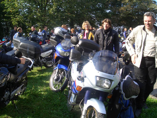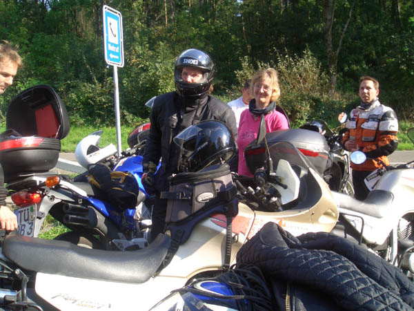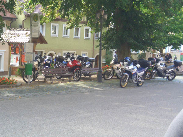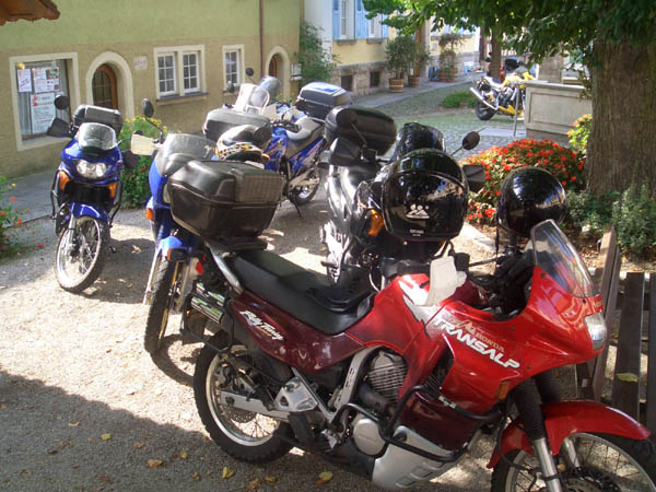 Ziel war Langenburg im Hohenloher Land. Nach dem Treffen in unserer Stammtischkneipe gings ein Mal quer durch das Kurvenparadies des Schwäbischen Waldes. Nach wahren Schräglagenorgien kehrten wir in Langenburg ein. Das historische Städtchen mit schönem Barockschloss und -park liegt auf einem Bergrücken mit Wahnsinns-Ausblick ins Tal. Natürlich machten wir dort auch unser Gruppenbild mit den 15 Transalps.