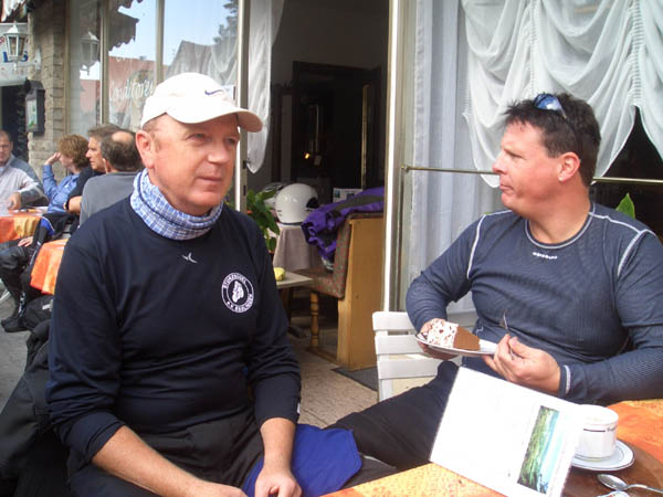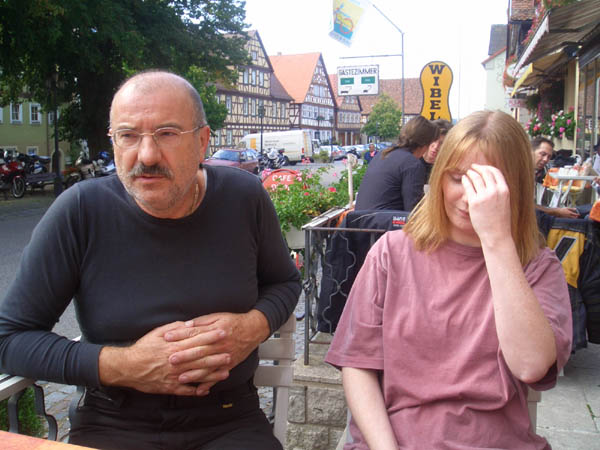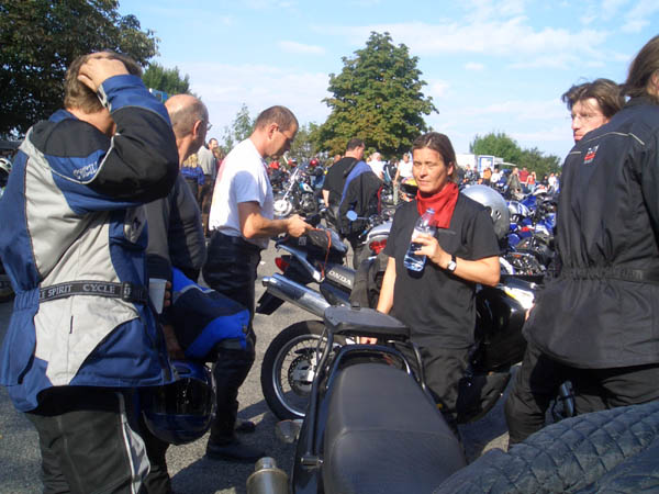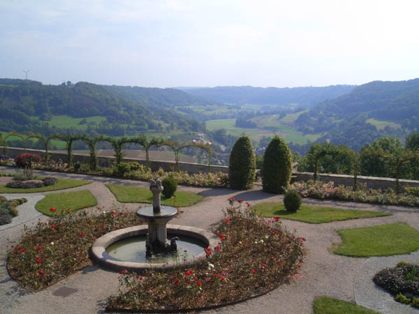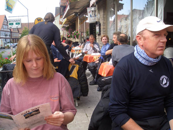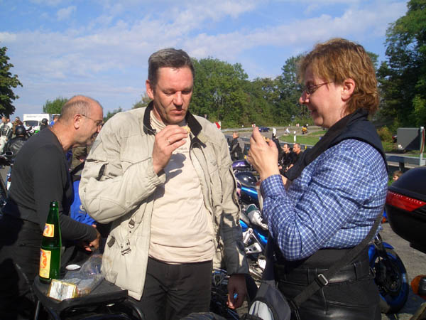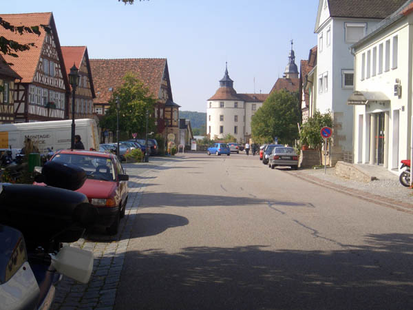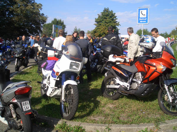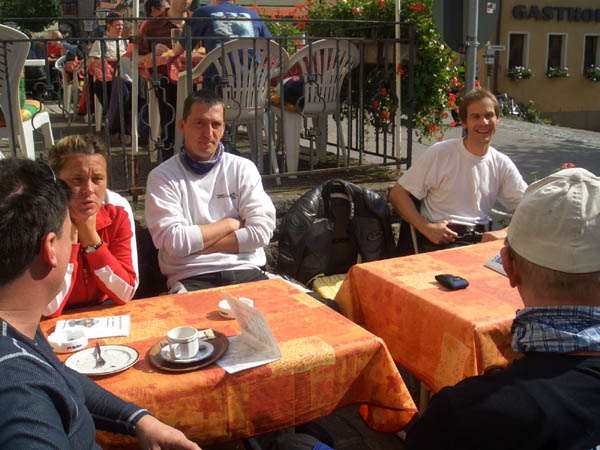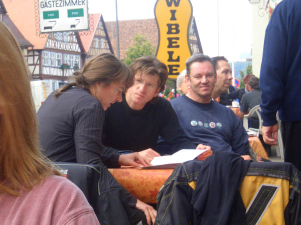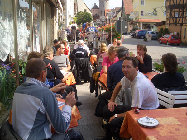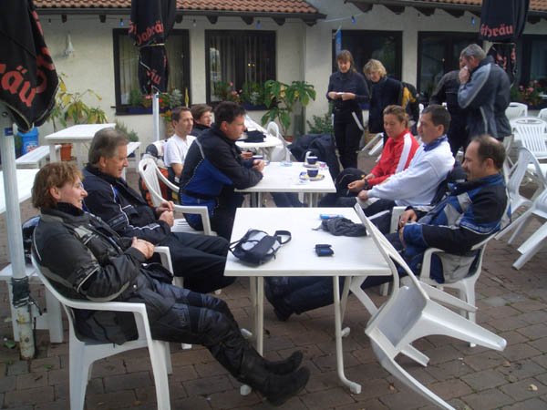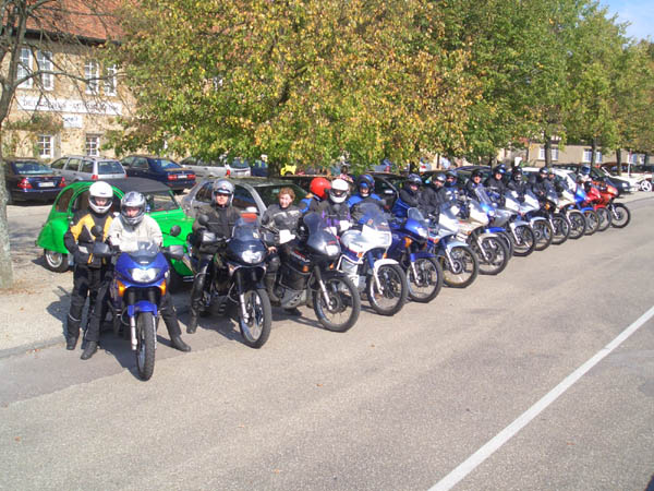 Ziel war Langenburg im Hohenloher Land. Nach dem Treffen in unserer Stammtischkneipe gings ein Mal quer durch das Kurvenparadies des Schwäbischen Waldes. Nach wahren Schräglagenorgien kehrten wir in Langenburg ein. Das historische Städtchen mit schönem Barockschloss und -park liegt auf einem Bergrücken mit Wahnsinns-Ausblick ins Tal. Natürlich machten wir dort auch unser Gruppenbild mit den 15 Transalps.